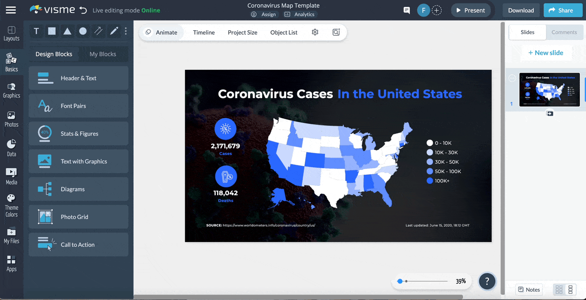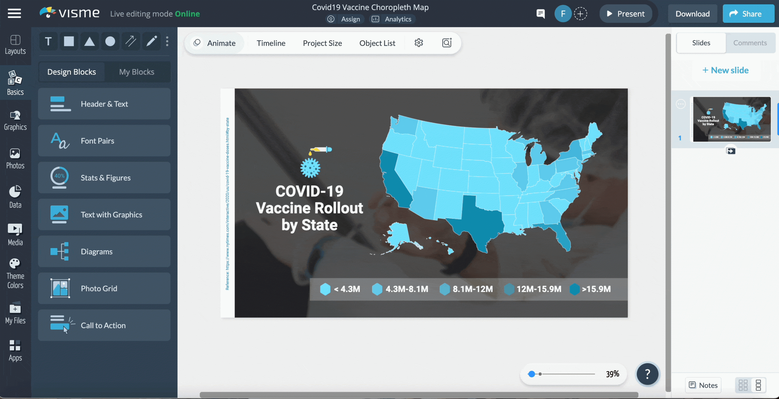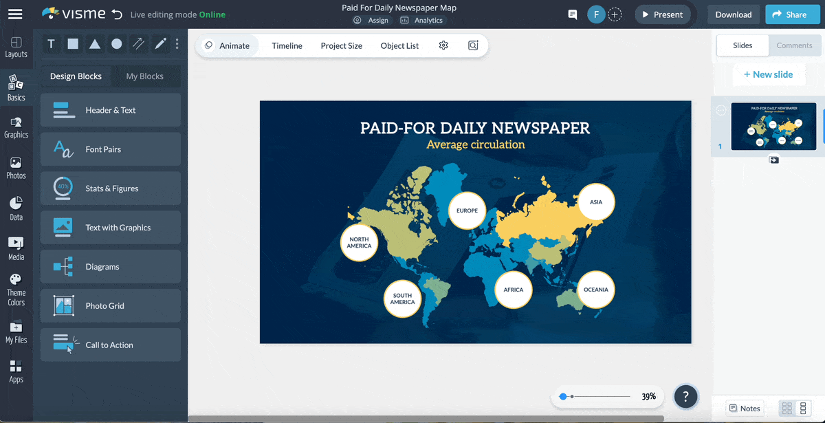 Creating maps with Visme is easy and straightforward. All you need is a Visme account, the relevant map data and a few minutes. The pre-designed map templates give you a solid foundation to work with, and the design options offer endless possibilities.