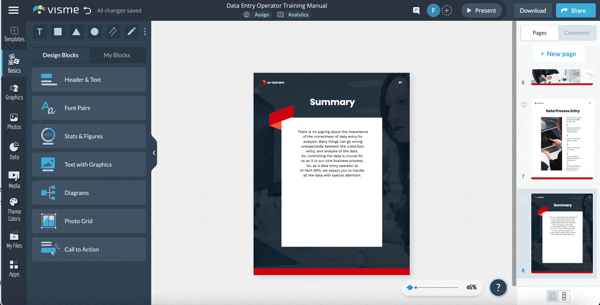 Learn more about how Visme can help training and development teams or sign up for a free account and try out our professional document creator for yourself.