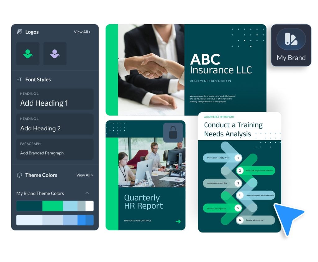 • AI-Branded Templates: Generate on-brand templates within locked compliance rules.