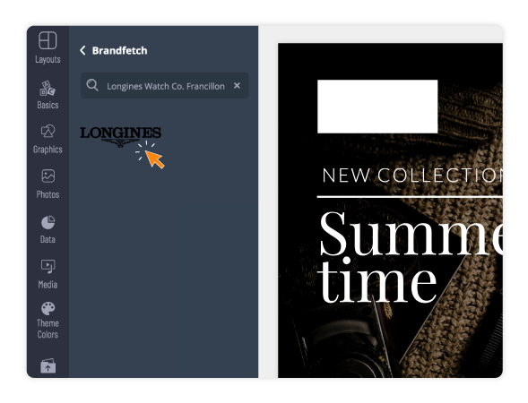 Access logos and branding of your brand and others right inside your Visme projects with our Brandfetch integration and search bar.