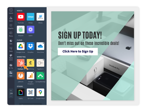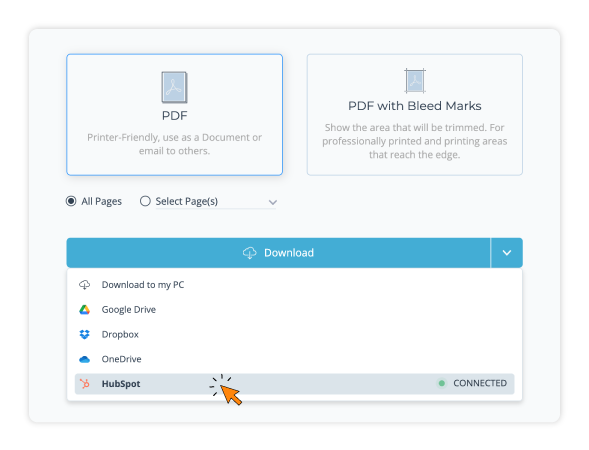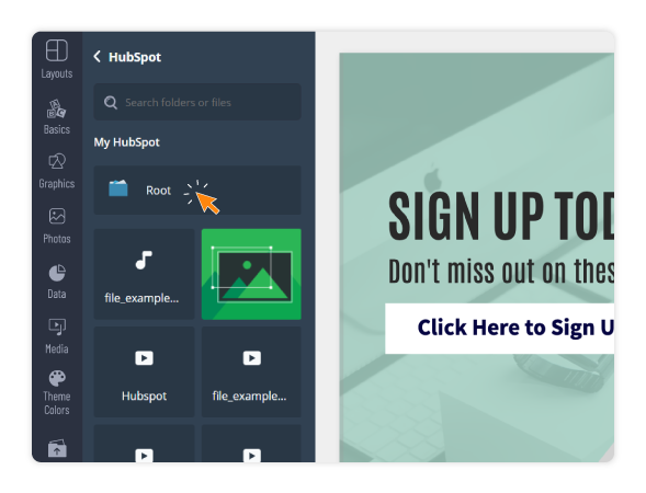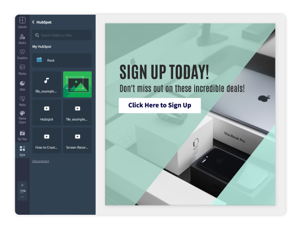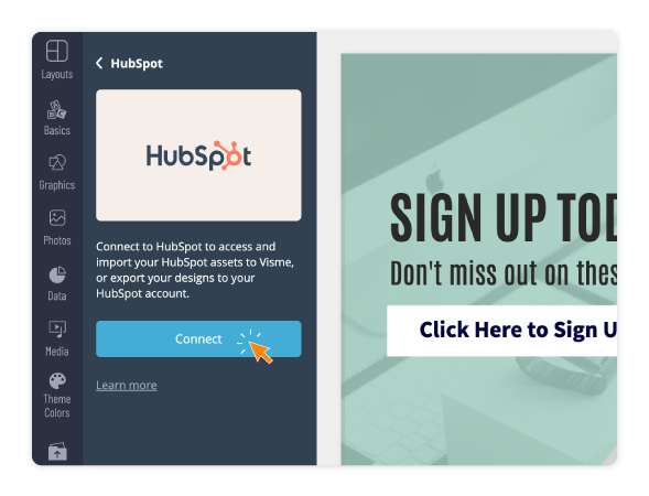 Connect to HubSpot using Visme's integration so you can easily share files between your HubSpot storage and your Visme designs.