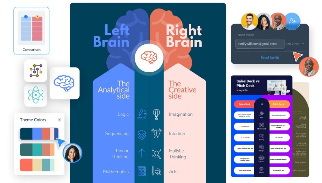 Вы можете использовать все актуальные функции таблицы Visme или просто использовать линии, стрелки и другие элементы дизайна для разделения каждого элемента или сравнения.