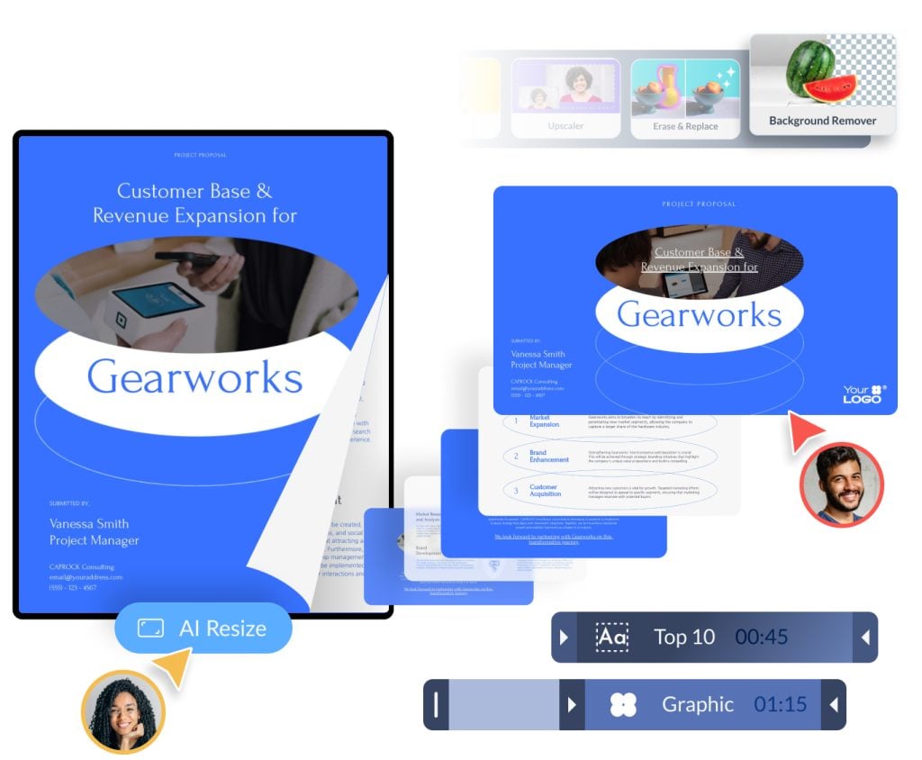 - Brand Asset Management: Upload important assets, then export in whatever format you need: editable PPTx, interactive HTML5, video, and more.